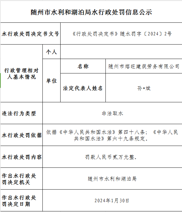 隨州市水利和湖泊局水行政處罰信息公示