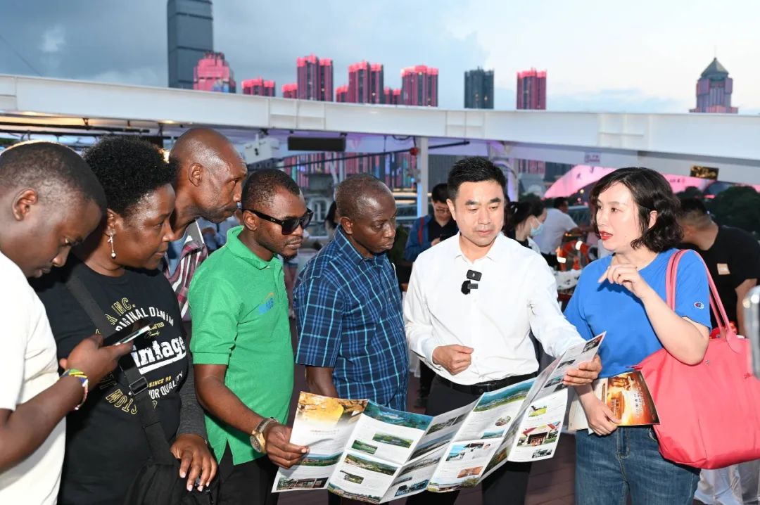 5月22日晚,在長江榮耀號游輪上,推介活動吸引了一群特殊的客人——來自“一帶一路”沿線國家的國際友人,在現場翻譯的幫助下,解局長向他們推介了隨州的文旅資源,贈送文創小禮品,獲得了他們的一致點贊。此外,記者現場采訪了一位來自山西省長治市的游客張女士,她說:“之前就了解過隨州,打算明天去隨州炎帝故里景區游玩,剛好在推介活動上獲得了解局長親自贈送的門票,很激動也很高興。”在長江榮耀號穿過長江大橋時,游輪上的市民游客們一起吶喊“武漢長江大橋,我們來啦”,將全場氣氛推向高潮。