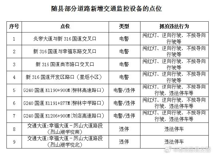 關于隨縣新增交通監控設備啟用交通違法管控的通告