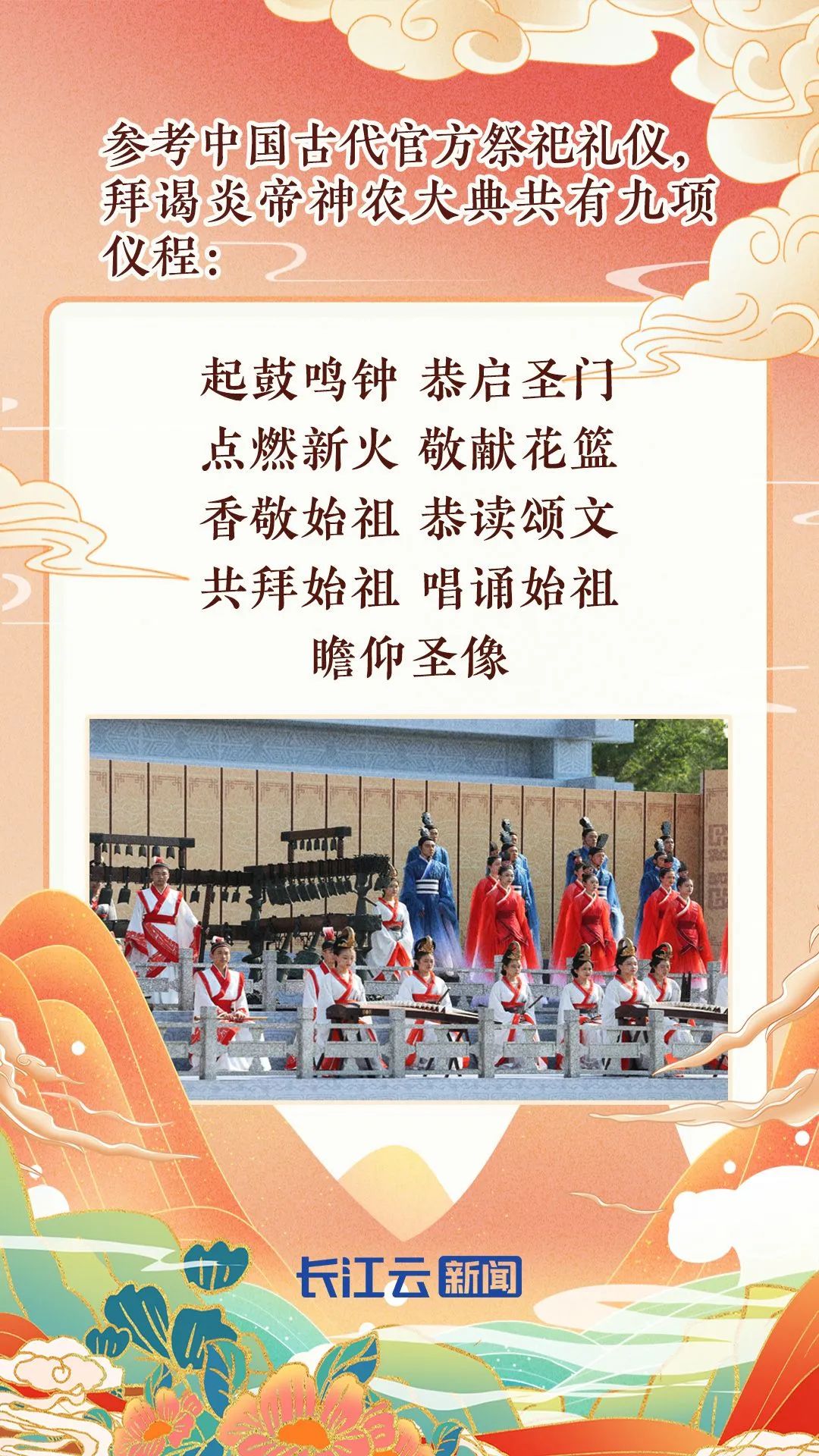 在儀式流程方面,設計有:起鼓鳴鐘、恭啟圣門、點燃新火、敬獻花籃、香敬始祖、恭讀頌文、共拜始祖、唱誦始祖、瞻仰圣像等九項儀程,充分融入了炎帝文化、荊楚文化、曾隨文化的元素;