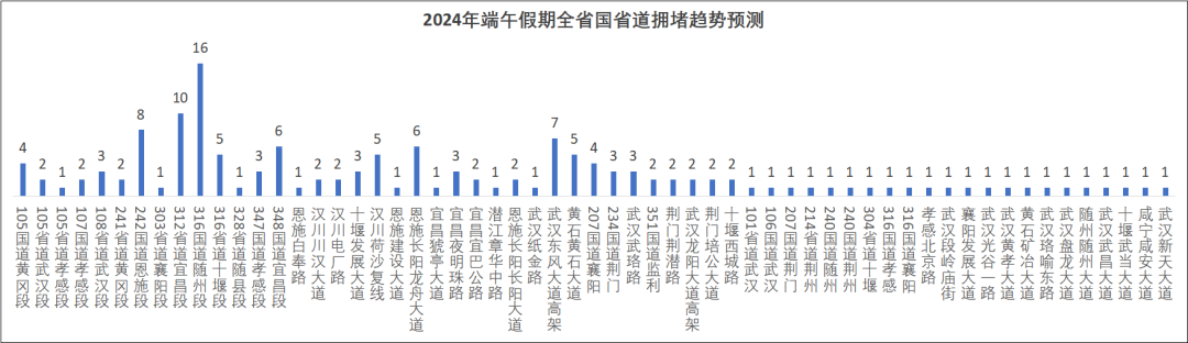 316國道隨州、十堰段,312省道宜昌段,242國道恩施段、348國道宜昌段,105國道黃岡段,207國道襄陽段以及武漢東風大道高架、恩施長陽龍舟大道、漢川荷沙復線、黃石黃石大道等路段擁堵程度較高。
