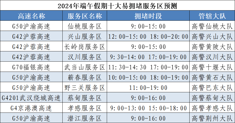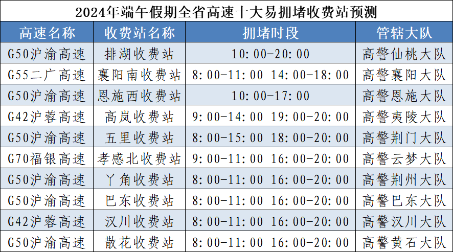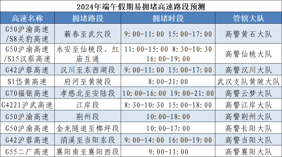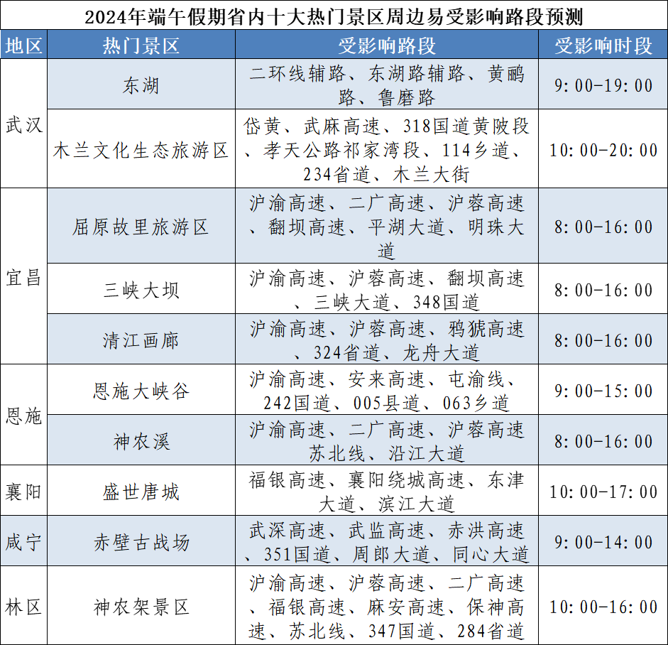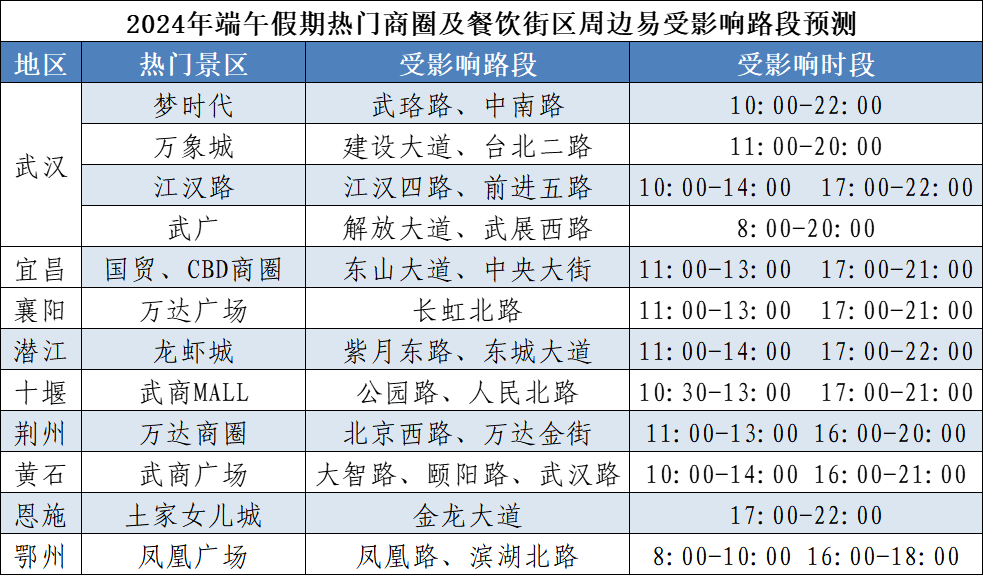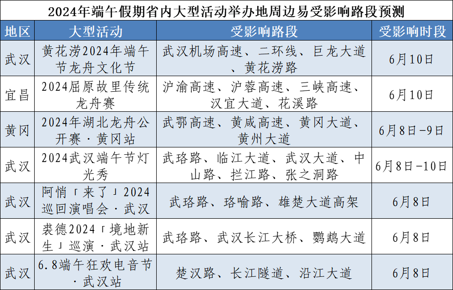 湖北交警預測:今年端午假期,擁堵時段主要集中在6月7日16~21時、6月8日9~12時、6月10日14~20時,其中第一日擁堵程度最高。假期,省內景區將備受游客青睞,城市商圈、廣場、公園等地群眾休閑逛街增多,因人流車流集中,部分路段易受影響。初步統計,端午假期省內將有龍舟賽、音樂節、燈光秀等7場大型活動,期間活動周邊道路因人流車流集中易發生交通緩行。