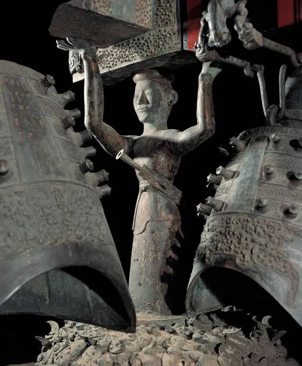 曾侯乙編鐘上的青銅武士。湖北省博物館供圖。記者不由繞編鐘再看一圈,更覺那武士頂托栩栩如生,鐘體鐘架氣勢磅礴,浮雕紋飾刻畫入微,黑漆紅彩的橫梁似深邃的歷史,剎那間鮮活起來。