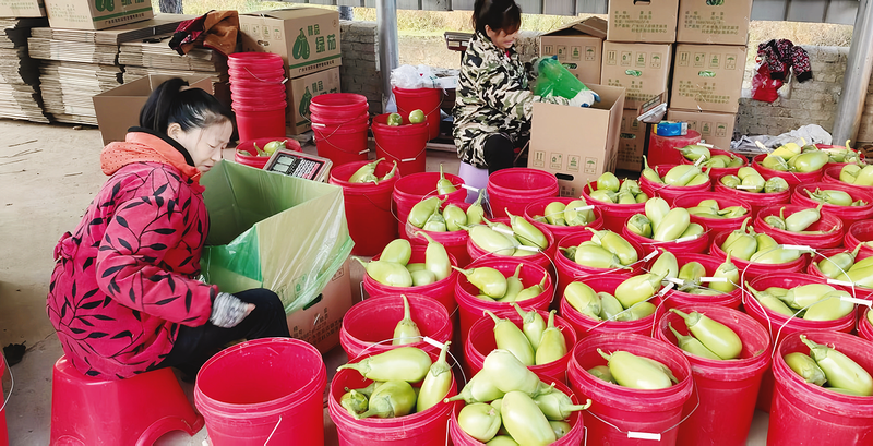 金秋十月,廣水市吳店鎮芝麻灣村茄子迎來豐收,該村依托“訂單+”模式,讓鮮茄搭上銷售快車,直達商超貨架。圖為村民打包茄子。??
