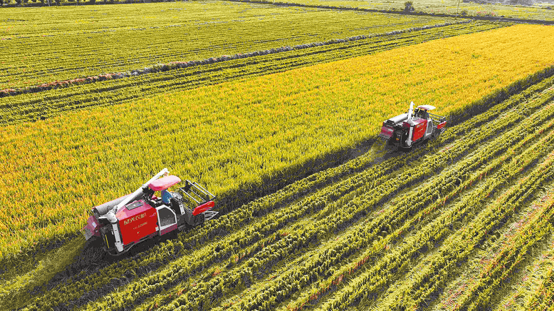 現場看到,機耕路一邊的數百畝香稻已收割完,另一邊的稻田里4臺聯合收割機來回轟鳴。機械過,連稈帶穗“吃”進去,稻穗脫粒裝車,秸稈粉碎還田。收割機滿車后,農用三輪車“接力”轉運,將稻谷運至合作社烘干廠。田邊4臺轉運車滿車去、空車回,與田里的聯合收割機有序“打配合”。
