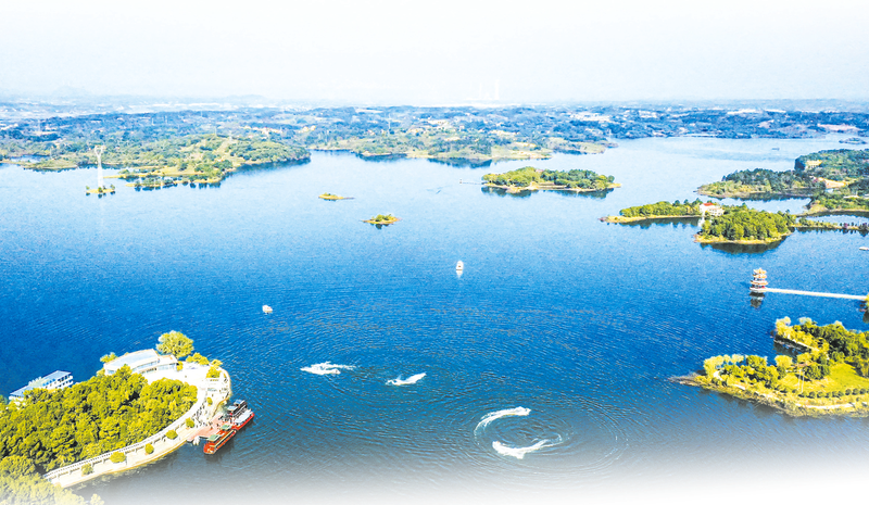 登臨隨州白云湖畔望城樓遠眺,湛藍天空下,青山如屏、綠水如帶,湖水倒映城市輪廓,一幅人與自然和諧共生的生態畫卷徐徐展開。?