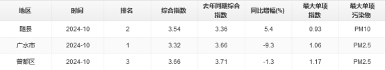 2024年1-10月,隨州市空氣監(jiān)測(cè)數(shù)據(jù):可吸入顆粒物(PM10)平均濃度值為52μg/m3,較去年同期降低7.1%;細(xì)顆粒物(PM2.5)平均濃度值為37μg/m3,較去年同期降低5.1%;二氧化硫(SO2)平均濃度值為7μg/m3,較去年同期無(wú)變化;二氧化氮(NO2)平均濃度值為13μg/m3,較去年同期降低18.8%;一氧化碳(CO)第95百分位值為1.0mg/m3,較去年同期降低9.1%;臭氧(O3)8小時(shí)最大值日第90百分位值為150μg/m3,較去年同期升高2.7%。