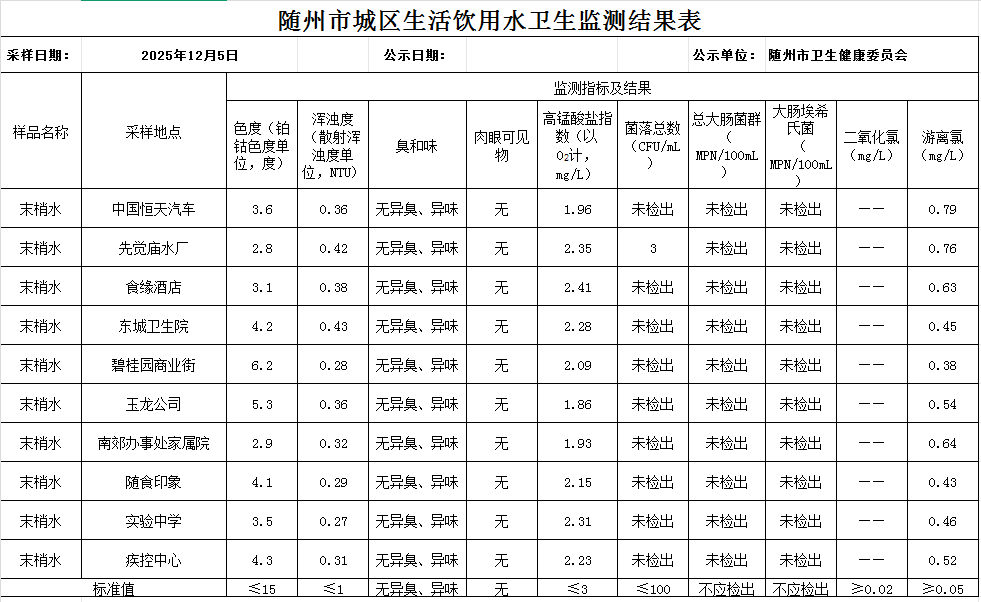 12.5隨州市城區(qū)生活飲用水衛(wèi)生監(jiān)測(cè)結(jié)果公示