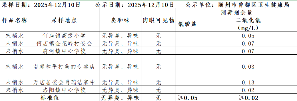 2025年12月10日曾都區鎮級生活飲用水衛生監測結果公示