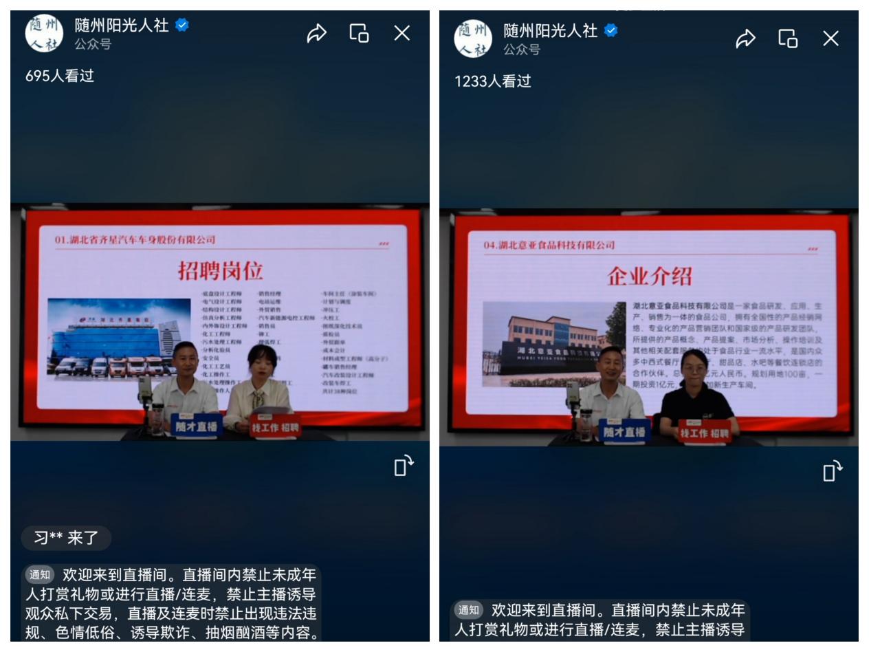 活動在湖北公共招聘網、“隨州人社”抖音平臺、“隨州陽光人社”微信平臺、隨才網進行全程直播,參與現場直播招聘平臺100多家企業。首場直播帶崗活動現場邀請了湖北省齊星汽車車身股份有限公司、湖北新東日專用汽車有限公司、湖北意亞食品科技有限公司等10家企業進入直播間參與互動,涉及專用汽車、新能源、新材料、機械制造、生物工程、現代農業等多個不同行業,提供崗位926個,招聘崗位涵蓋工程師、技術研發、市場營銷、新媒體運營、操作工等。