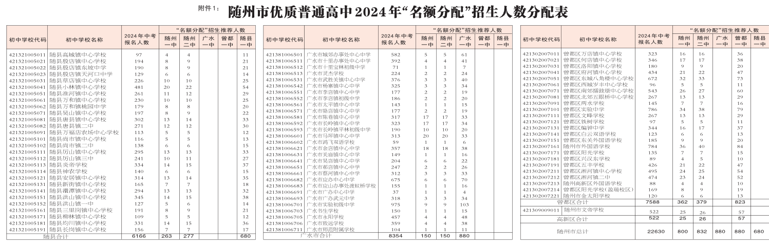 隨州市優(yōu)質(zhì)普通高中2024年“名額分配”招生人數(shù)分配表