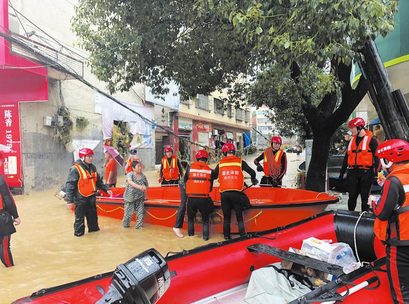 ?????消防救援人員在隨縣柳林鎮轉移被困群眾。(隨州日報全媒記者劉詩詩攝)