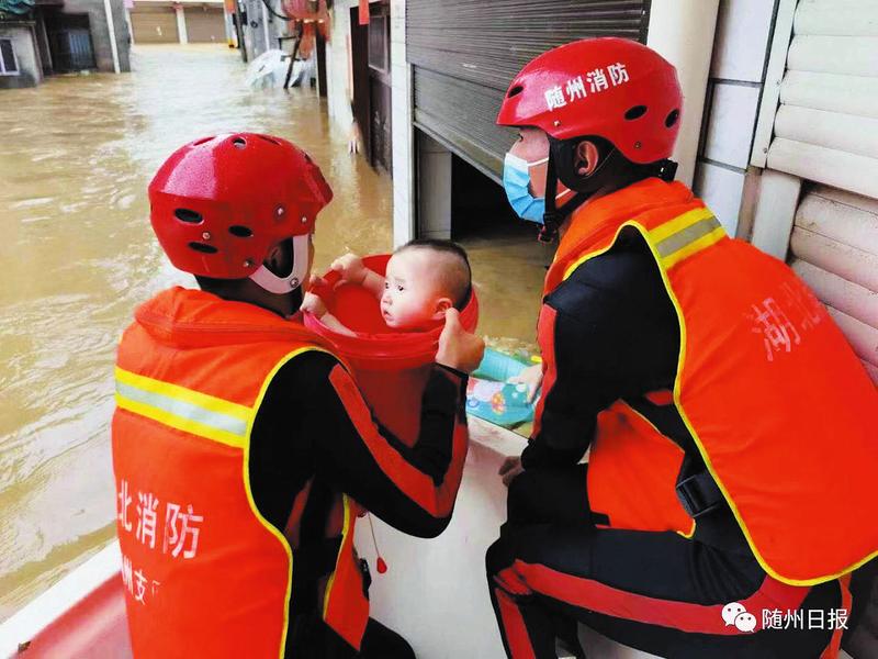 消防救援人員從危險地段轉移出一名幼兒。(隨州日報通訊員肖宣攝)