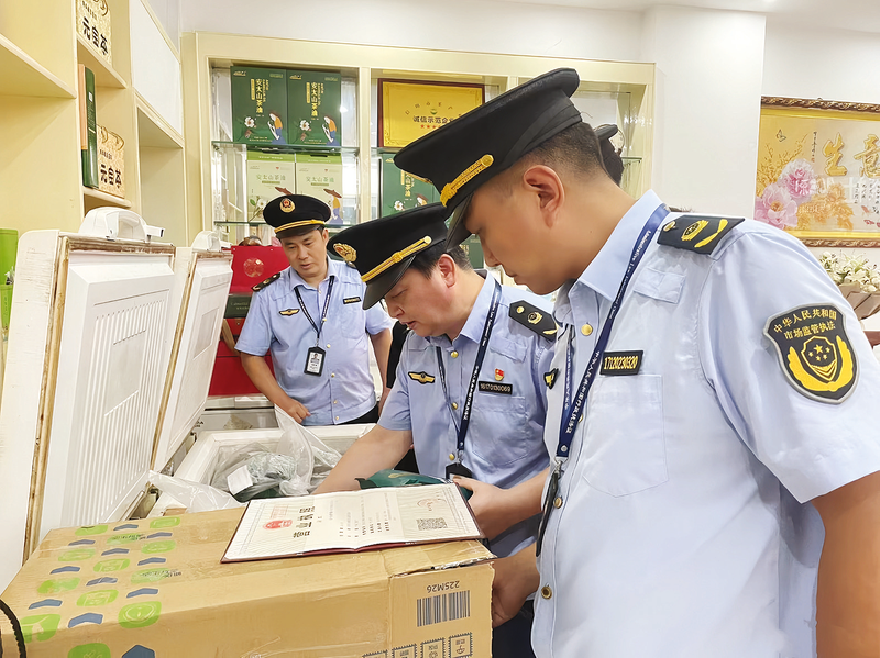 9月5日至6日,廣水市市場監督管理局和信陽市浉河區市場監督管理局對茶葉市場實施年度跨省聯合檢查。執法人員從100余家不同信用風險等級的茶葉經營者中,隨機抽檢了25家市場主體。圖為執法人員對商家進行檢查。