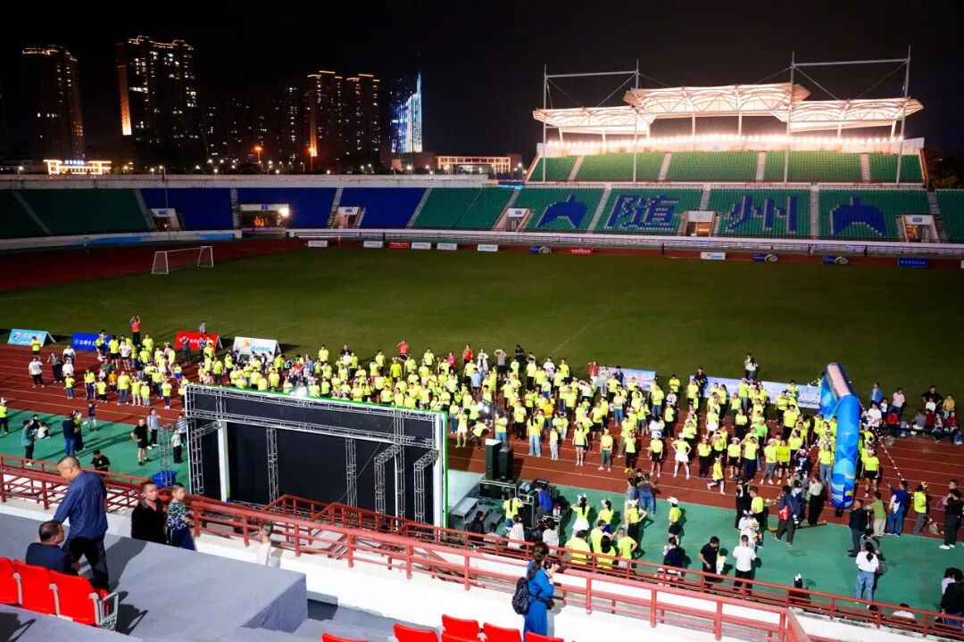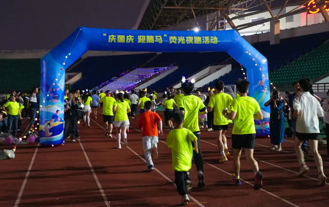 10月4日晚,2025年“慶國慶 迎隨馬”熒光夜跑活動舉行,400多名跑步愛好者頭戴發光發夾、身著螢光綠T恤變成“發光體”,在隨城濱湖體育館歡樂開跑。