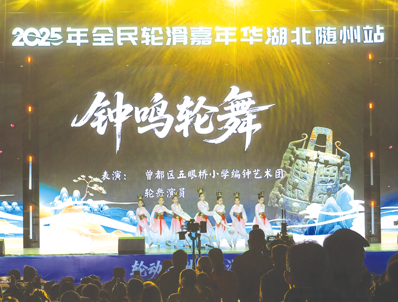 活力綻放,輪滑盛會為隨州城市宣傳“加速度” 現場敲響編鐘,穿著輪滑鞋的古裝舞者水袖翻飛。輪滑之夜,曾侯乙編鐘樂團與輪舞演員共同帶來創新表演《鐘鳴輪舞》,將古老的金石之音與青春活力的輪滑融合,令來自全國各地的參賽選手們印象深刻。