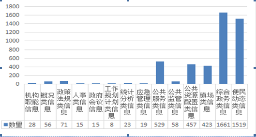 ????政府網站公開信息4882條,其中:機構職能信息28條;概況類信息56條,政策法規類信息71條,人事類信息15條,政府會議信息15條,工作規劃計劃類信息8條,統計分析類信息23條,應急管理類信息19條,公共服務類信息529條,公共監管類信息58 條,公共資源配置類信息457 條,鎮場類信息423條,綜合政務類信息1661條,便民動態類信息1519 條。