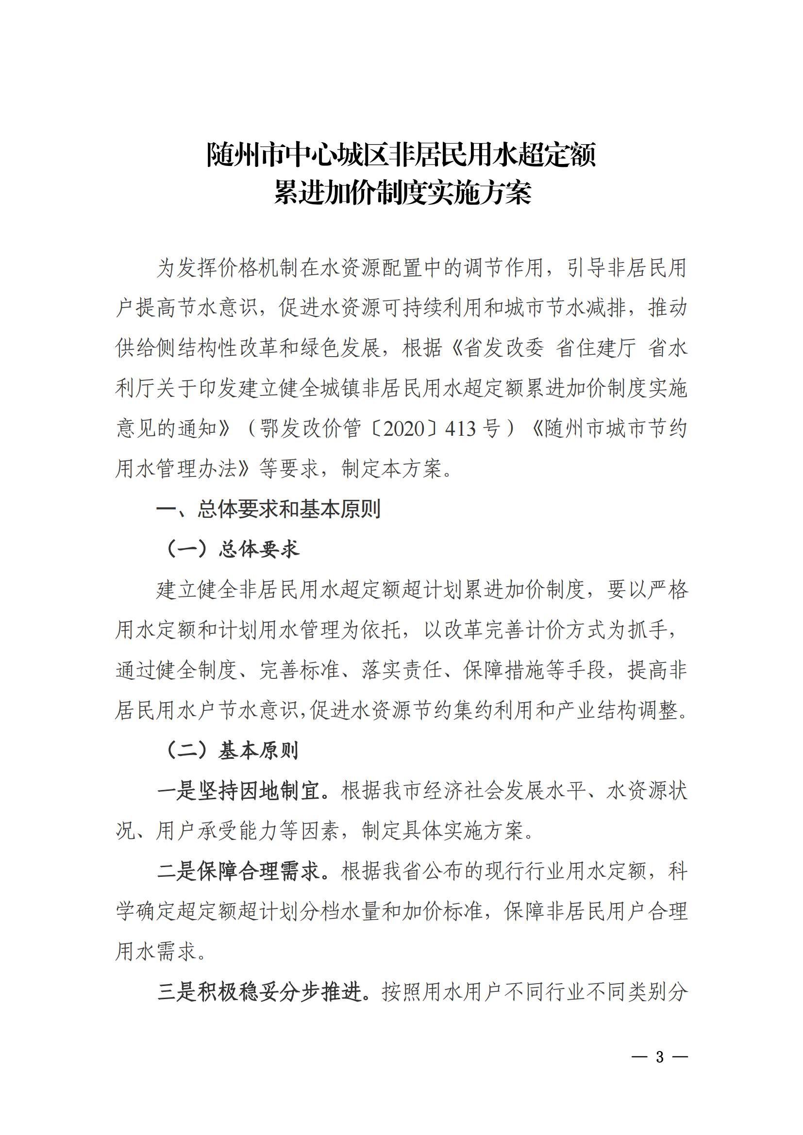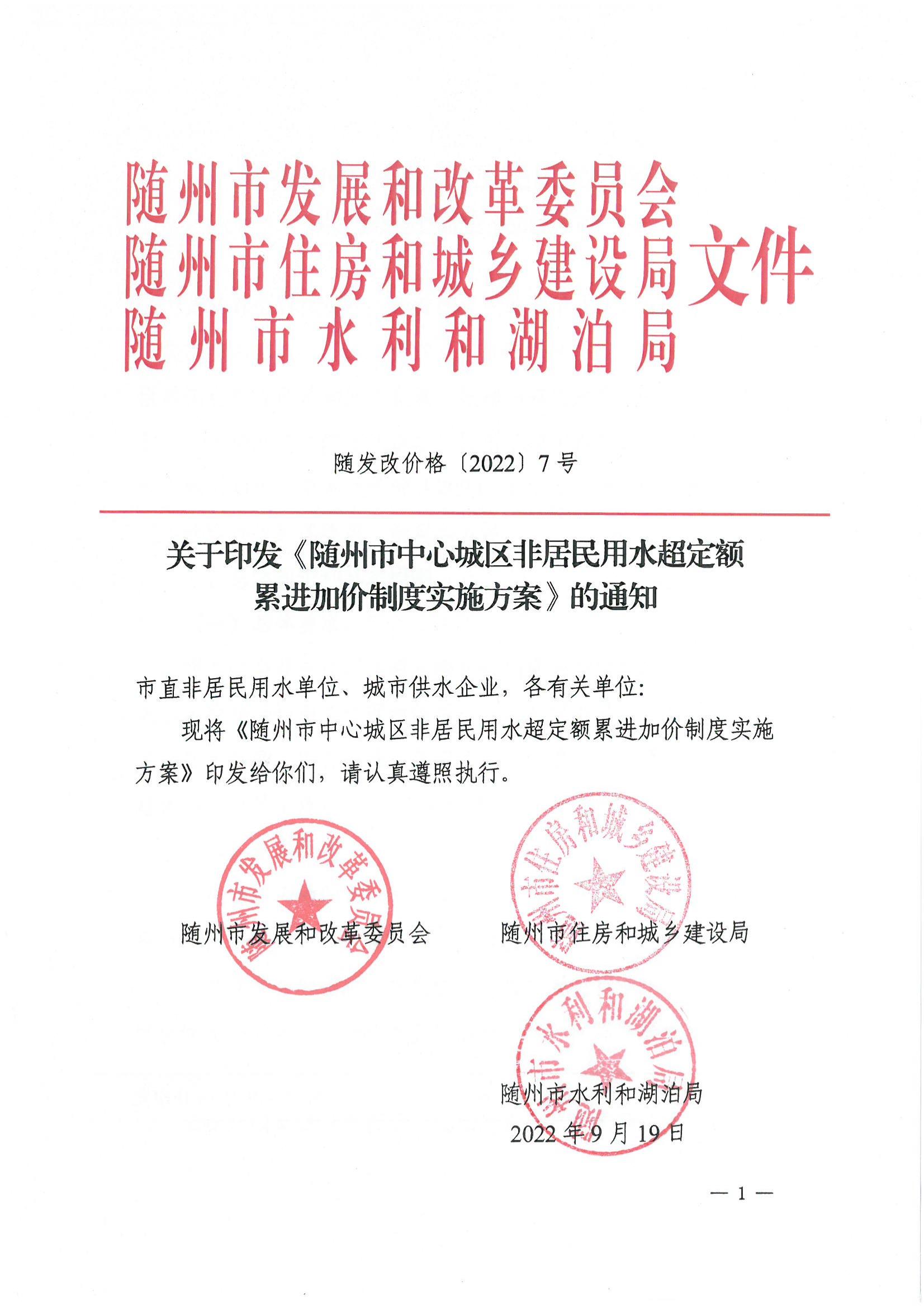 隨州市發展和改革委員會 隨州市住房和城鄉建設局 隨州市水利和湖泊局 關于印發《隨州市中心城區非居民用水超定額累進加價制度實施方案》的通知