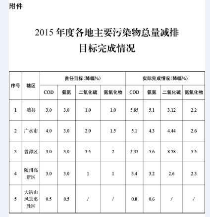 隨州市人民政府關(guān)于2015年度全市主要污染物總量減排目標(biāo)完成情況的通報(bào)
