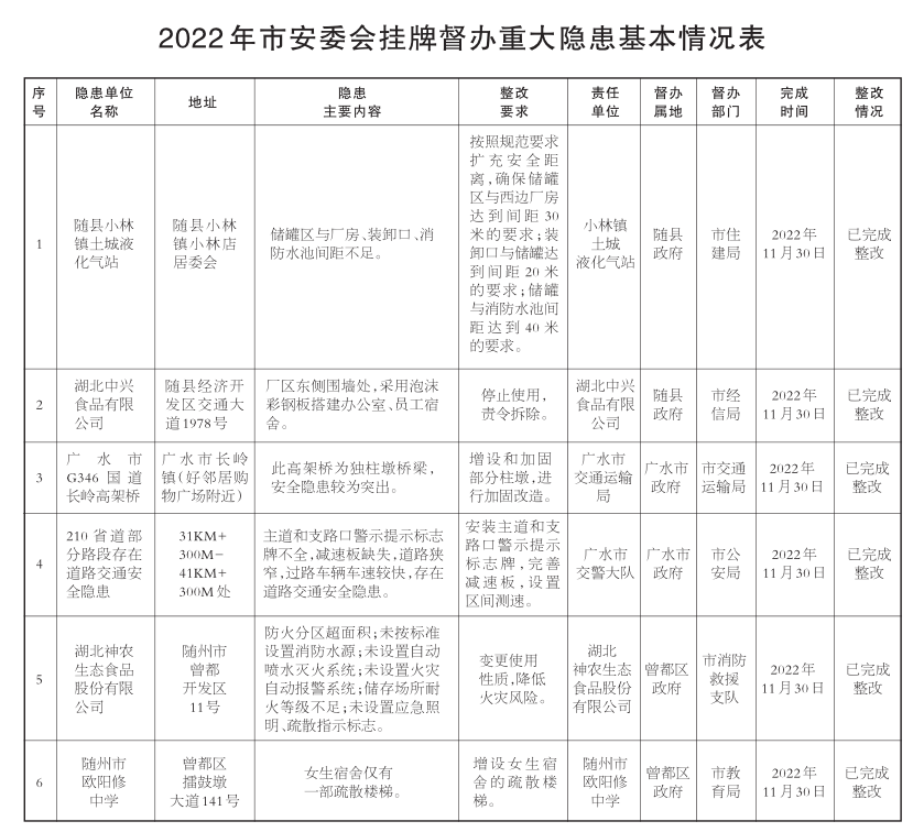 按照《市安委會關于2022年掛牌督辦重大安全隱患的通知》(隨安〔2022〕7號)要求,各縣、市、區政府,市教育局、市經信局、市公安局、市住建局、市交通運輸局、市消防救援支隊及各整改責任單位(企業)認真落實安全生產責任,嚴格按照整改措施完成整改工作,及時消除了一批重大安全隱患。