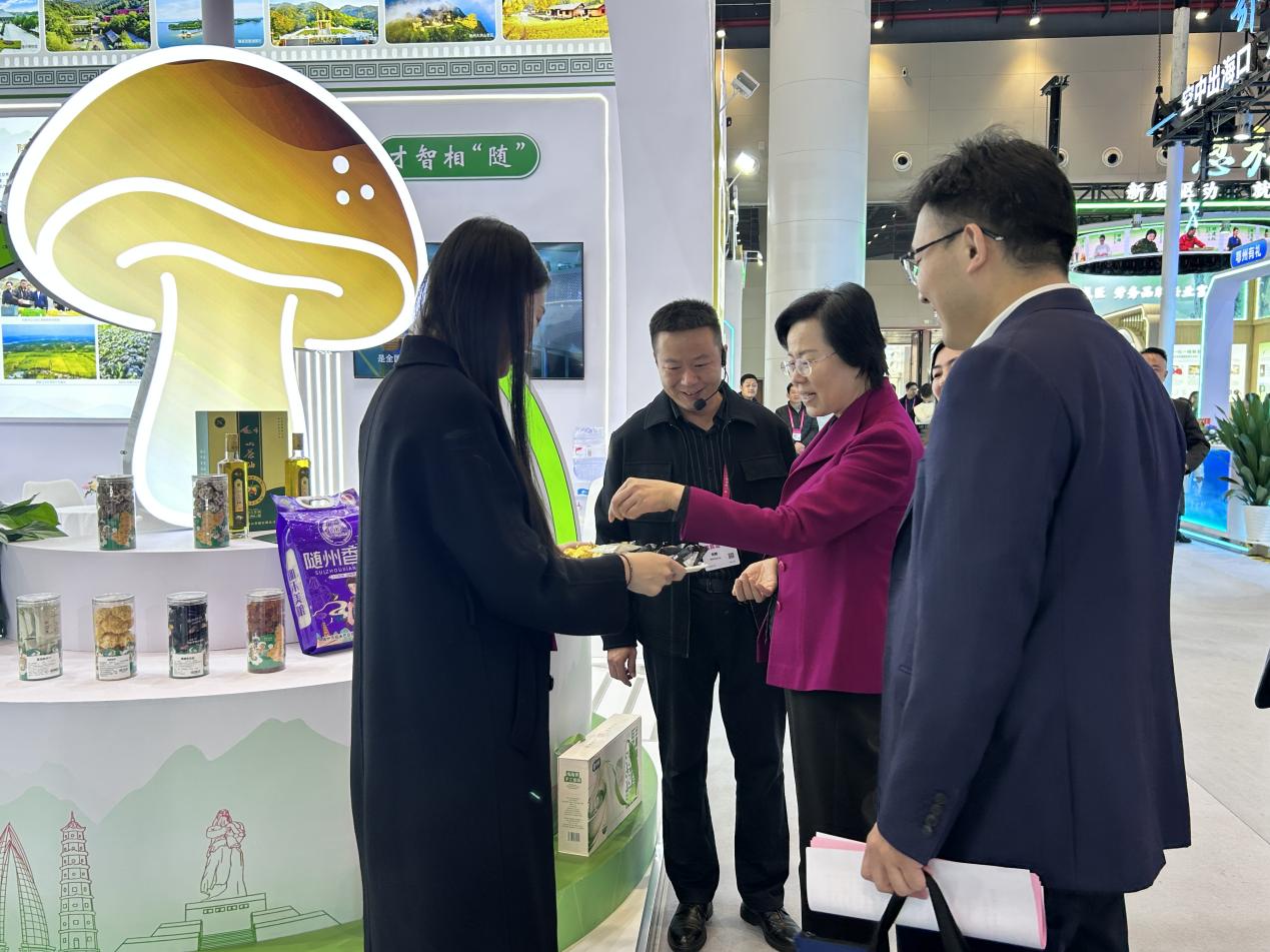 ????11月29日下午,湖北省人力資源社會保障廳廳長李述永專程來到隨州展臺視察指導。李述永廳長對隨縣以勞務品牌建設推動產業升級、促進就近就業的做法給予充分肯定,并現場品嘗了隨縣香菇脆等特色產品,對其品質與產業價值予以高度認可。